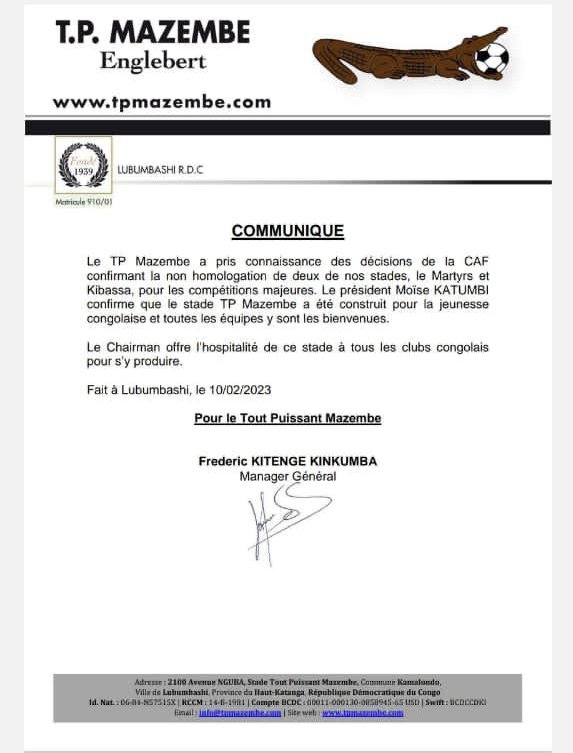 « `Le TP Mazembe a pris connaissance des décisions de la CAF confirmant la non homologation de deux de nos stades, le Martyrs et Kibassa, pour les compétitions majeures. Le président Moïse KATUMBI confirme que le stade TP Mazembe a été construit pour la jeunesse congolaise et toutes les équipes y sont les bienvenues.